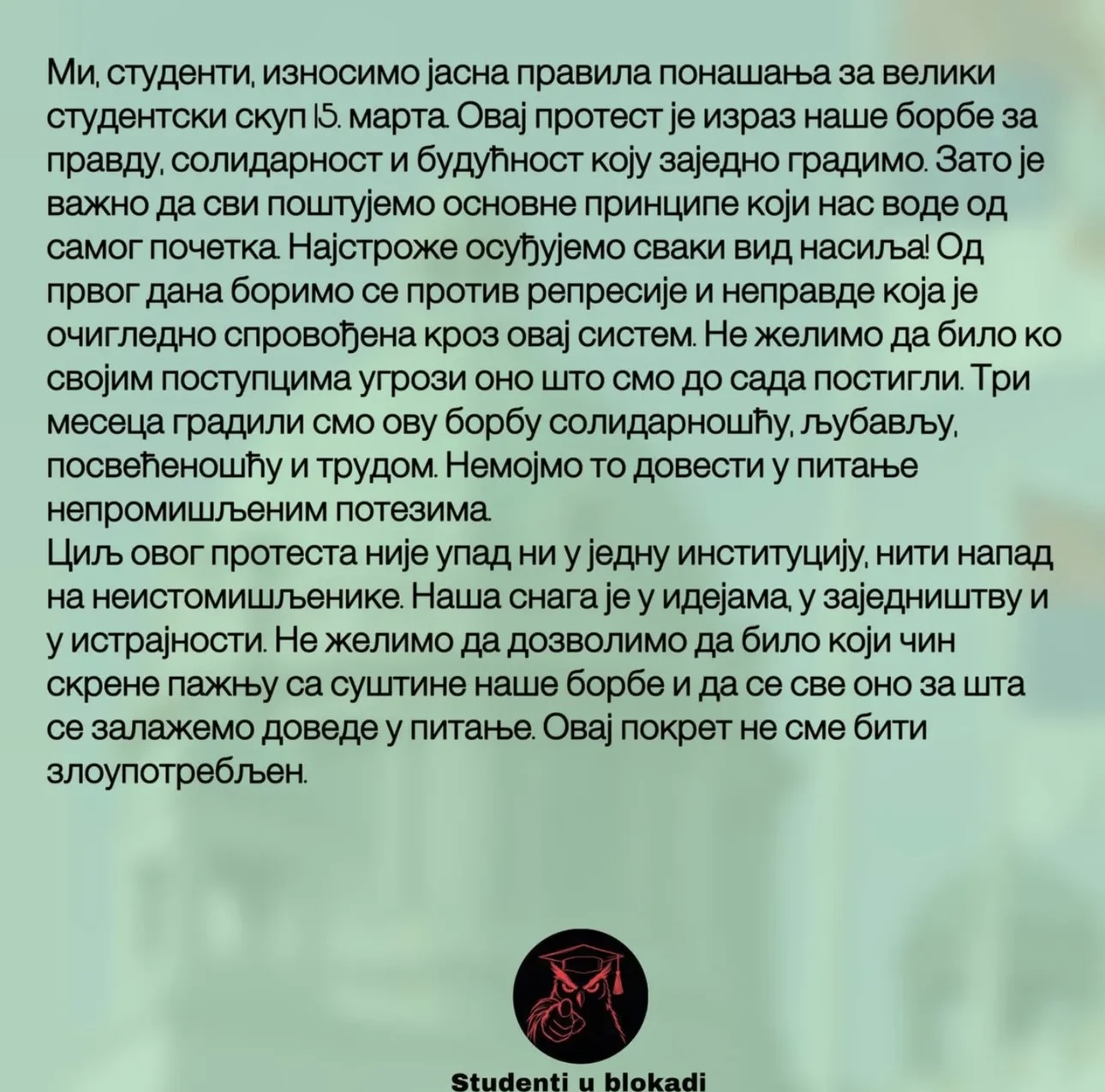 “Cilj ovog protesta nije upad ni u jednu instituciji, niti napad na neistomišljenike. Ne želimo da dozvolimo da bilo koji čin skrene pažnju sa suštine naše borbe i da se sve ono za šta se zalažemo dovede u pitanje. Ovaj pokret ne sme biti zloupotrebljen. Moramo ostati dostojanstveni i pokazati da smo odgovorni, da razumemo težinu trenutka i da smo svesni poslednica svojih postupaka”, naglašavaju u svom saopštenju studenti u blokadi.